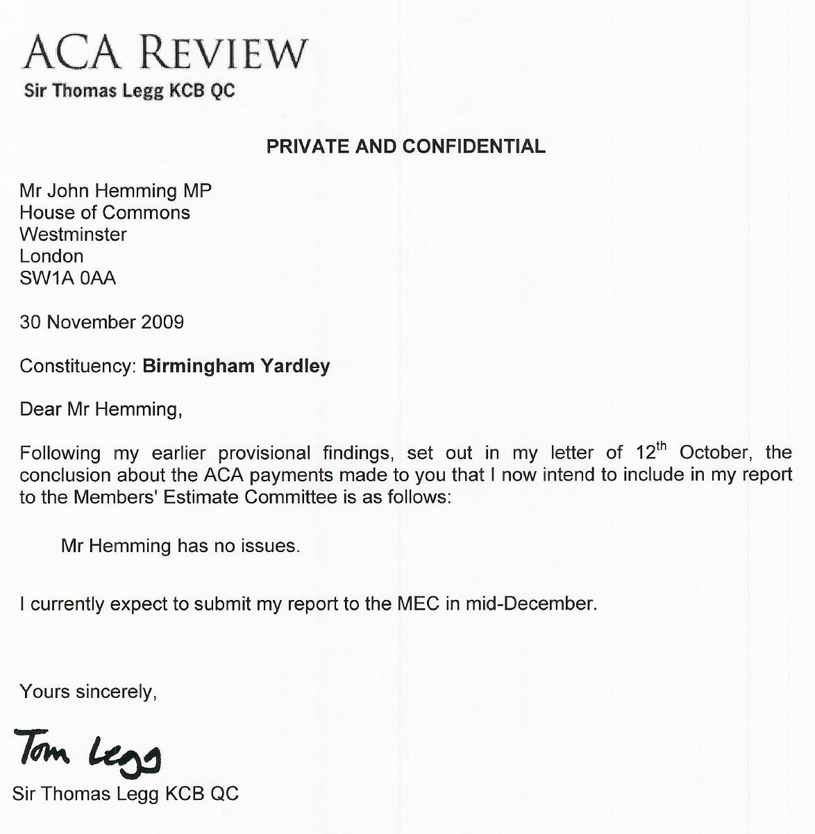 Every so often Labour criticise John Hemming on expenses. A detailed review of every member of parliament was done in 2009 and the conclusion letter appears below: